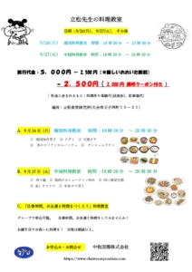 9月27日 (火) 中国料理教室 時間 : 18時30分 ~ 20時30分