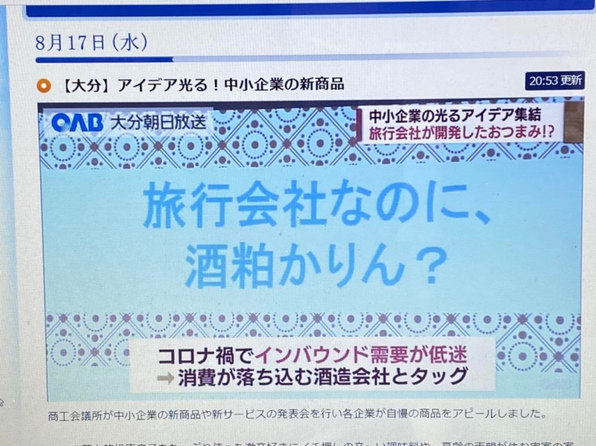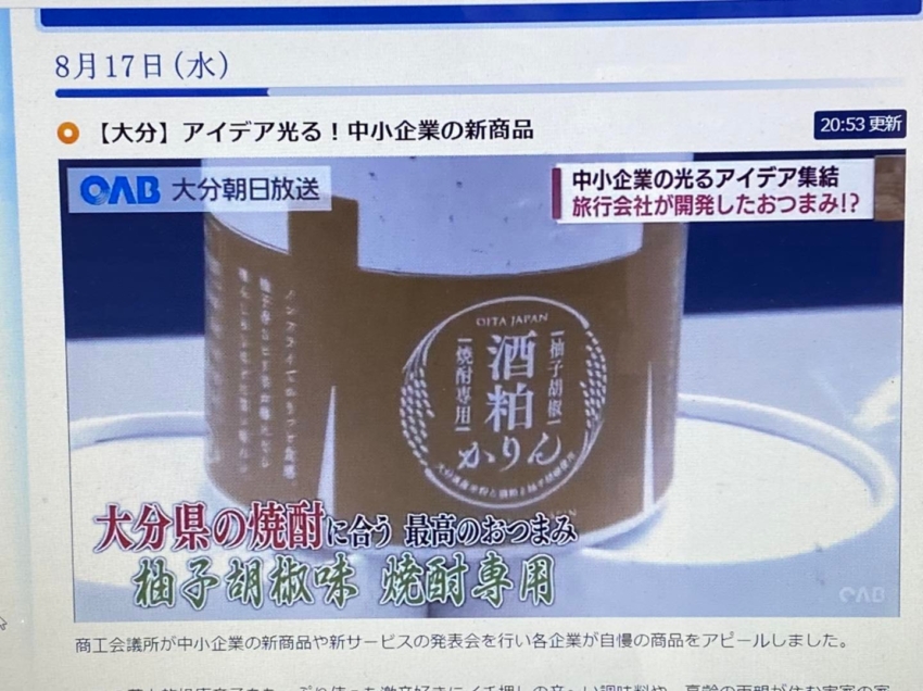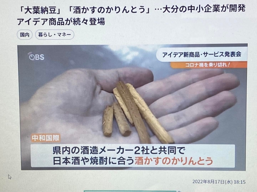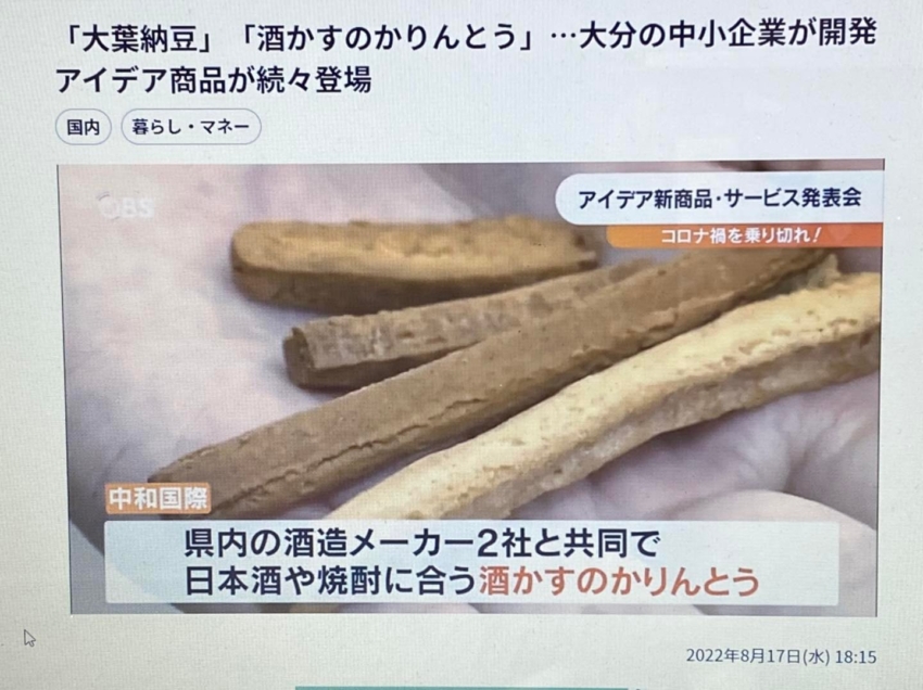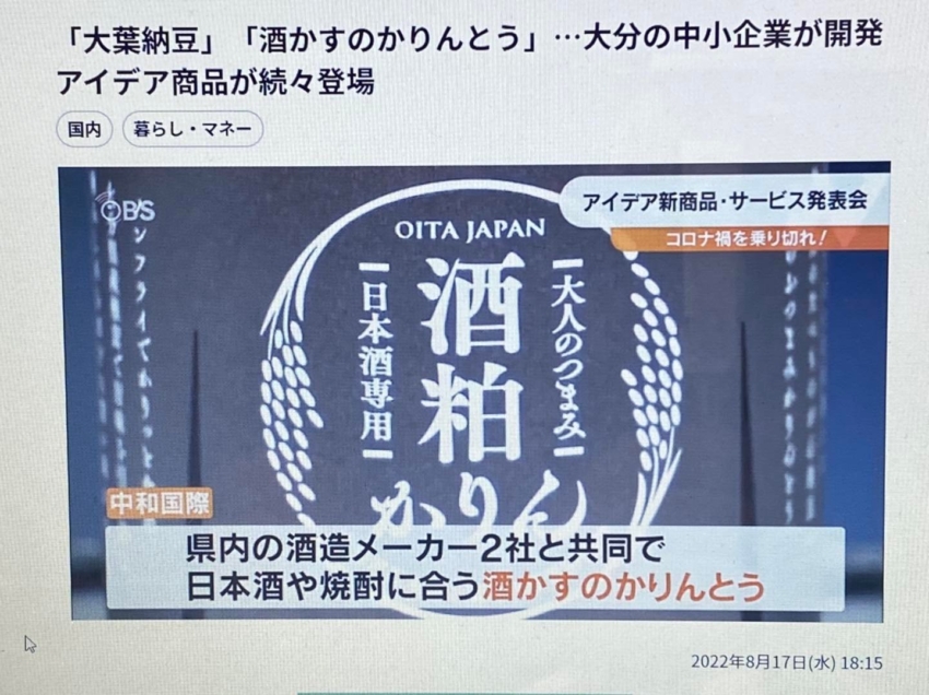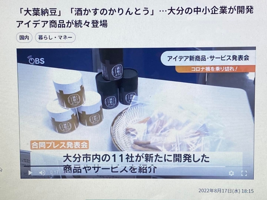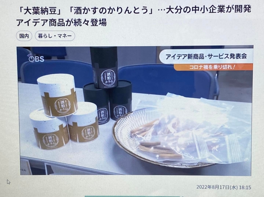 第14回 新商品・新サービス合同プレス発表会大分商工会議所 主催 にて、「 酒粕かりん 」の開発ストーリーを発表させて頂き、夕方のニュースで取り上げて頂きました。